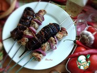 Мясо готово. Готовим баклажаны. Я их возьму целиковыми. Сделаю на баклажанах по 5 надрезов, не разрезая до конца. Бекон в нарезке нарежу на кусочки, количество которых будет соответствовать количеству надрезов. Выложу на тарелку, посолю, поперчу. Смажу баклажаны и внутри, и снаружи маслом и вложу в каждый надрез бекон. Я возьму двойные шампуры 2 шт. На одну сторону нанизаю мясо индейки, чередуя его с кольцами красного лука. На другую сторону - баклажан. Закреплю растяжку. Я буду сегодня использовать электрическую духовку гриль с верхними элементами нагревания Т-220 С и сделаю шашлык в ней. Подставлю на низ поддон, куда будет капать жир. Шашлык готовится очень быстро в разогретой духовке при верхнем нагреве и приоткрытой дверце, буквально 15-20 минут. |