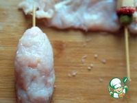 Плотно обернуть шпажку отбитой индейкой. Готовит на решетке на мангале до готовности. Можно и в духовке, заранее разогретой до 180 гр., 25-30 мин. |