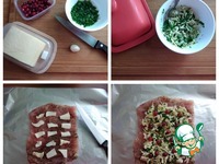 В начинку я возьму сыр твёрдый пожирней, зелень мелко порубленную: укроп; петрушку; лук зелёный, чеснок, клюкву и сливочное масло. Масло сливочное с сыром жирным придаст рулету очень сливочный вкус. Сыр натираем на тёрке средней, чеснок и зелень мелко рубим. Всё перемешиваем. Отрезаем большой кусок фольги, чтобы можно было хорошо завернуть скрученный рулет. Если вы будите делать рулет в углях на природе, то возьмите 2 куска фольги, сначала завернёте в один кусок, потом для страховки обернёте во второй. чтобы фольга не прорвалась и сок не вытек. Выкладываем прямоугольник филе в специях на фольгу. На кусок филе выкладываем кусочки сливочного масла по всему периметру, сколько поместится. Раскладываем начинку аккуратно ( см. фото! ). Выкладываем клюкву свежую или мороженную. Клюкву можно и не класть, если её нет у вас. |