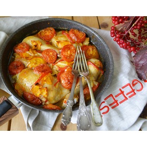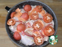Помидор режем толстыми кольцами и кладём сверху. Ставим сковороду (форму) в нагретую до 180-200 градусов духовку, запекаем 50-60 минут до золотистого цвета. |