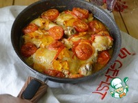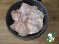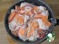 Маринованные куски курицы смешиваем с овощами и кладём в форму для запекания, у меня - сковорода. |