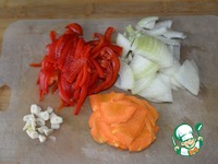 Овощи чистим, моем. Лук режем тонкими полукольцами или четвертинками, перец полосками, чеснок ломтиками, морковь тонкими кружками или половинками. |