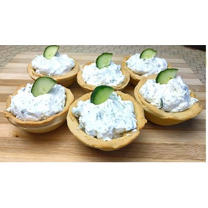 Выложить начинку в тарталетки и украсить дольками огурца.