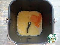 Тесто я буду готовить в хлебопечке. В ведёрко хлебопечки вылить теплое молоко, добавить яйцо, сахар, соль, растопленное сливочное масло, сметану. |