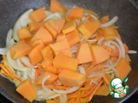Кладём тыкву на сковороду к овощам, тушим на среднем огне 5 минут. |