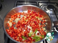 Тем временем нарезаем болгарский перец мелким кубиком. Острый перец нарезаем кружочками. |