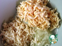 В отдельную посуду натереть репчатый лук, брынзу и плавленный сыр. |