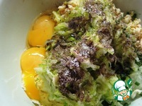 Натертый кабачок хорошо отжать руками от жидкости и добавить к остальным ингредиентам. |