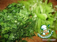 Перец сладкий тоже соломкой. Зелень измельчить. |