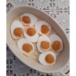 Описание: В нашу интернетную эру множество хозяек черпают вдохновение в сети. Я вот, когда начинаю искать какой-нибудь рецепт, ингода испытываю странное чувство - информации порой так много, что нет никакой возможности остановиться на чем-то конкретном. В такие моменты мне хочется открыть либо мамины старые "гроссбухи", где вклеены рецепты из винтажных ныне газет и журналов, типа "Работницы" или "Крестьянки", либо обратиться к классическим книгам по кулинарии. В этот раз мне захотелось приготовить какое-нибудь блюдо из яиц. Изучив в интернете миллион рецептов, я что-то приуныла - то слишком вычурно, то слишком "майонезно", то просто не хочется. И тогда я пошла к книжной полке, сняла книжку "Страви з яєць" ("Блюда из яиц") классика украинской (и советской) кулинарии Дарии Цвек. Пани Дария уникальная личность - ее книги издаются миллион лет, многие стали бестселлерами. В этот раз я выбрала "Варені яйця під соусом з хрону" (Вареные яйца под соусом из хрена). Ну что сказать, по вкусу блюдо оказалось не очень современным. Так готовила моя бабушка - вкус простой, без изысков, излишней остроты и пикантности. Современные "едоки" избалованы более богатыми ощущениями. Но, вы знаете, гости оценили поданные яйца. На мамин день рождения готовила две порции - умяли обе. Поэтому делюсь)