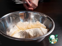 С бани не снимать, просто выключить огонь под кастрюлей. Если тесто остынет, оно станет как жвачка, и будет невозможно тонко размазать. Не бойтесь просветов. Оно очень хорошо поднимается. |