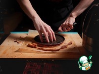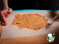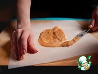 На силиконовом пергаменте с изнанки рисуем круг диаметром 18 см. Влажным ножом размазываем 1 ст. л. теста в этой рамке. |