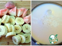 Банан и персик порезать на кусочки, для мгновенного и равномерного измельчения в миксере. Отмерить необходимое количество варенца. |
