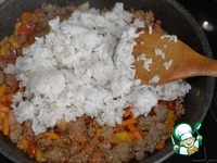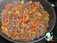 Овощи чистим, моем. Лук режем мелкими кубиками, морковь трём на тёрке или мелко режем, кладём к обжаренному фаршу. Перемешиваем, тушим на среднем огне 5 минут. |
