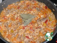 Перемешиваем, кладём лавровый лист. Тушим на среднем огне около 10 минут при периодическом помешивании. |