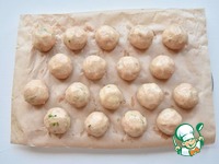 Из подготовленного фарша сформировать небольшие тефтельки, весом примерно 35-40 граммов. Выложить их на пергамент и запечь в духовке, разогретой до 180 градусов в течение 15 минут. |