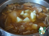 Варить 20 минут, добавить кубики картофеля и кусочки моркови, посолить, варить до готовности овощей. |