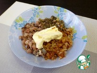 В миске соединить остывший жаренный лук, нарезанные маринованные грибы и селедку. Всех составляющих должно быть примерно одинаковое количество. |
