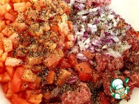 Помидоры и лук мелко нарезать. Смешать с фаршем. Фарш посолить и поперчить. |