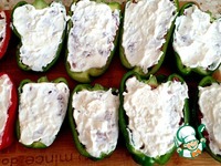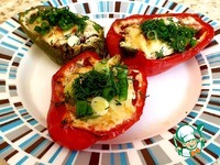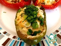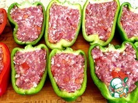 Перцы разрезать пополам и очистить от семян. Наполнить половинки перца фаршем. |