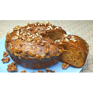 Готовый торт достать из духовки и, пока он горячий, не доставая из формы, полить его глазурью. Сверху посыпать грецкими орехами.