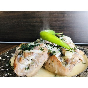 6. Готовые бёдра перекладываем на блюдо, поливаем сливочным соусом, посыпаем зеленью и подаём к столу.