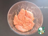 Взбиваем 2 яйца. Замаринованные грудки обвалять в муке, затем в яйце и жарить на сковороде гриль в растительном масле (примерно 40мл), на среднем огне. |