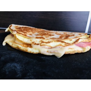 5. Переворачиваем блин, тортильей вниз, и на один край выкладываем сыр, а поверх сыра ветчину. Сворачиваем блин пополам, так чтобы начинка была закрыта. Поджариваем с двух сторон, до румяной корочки тортильи.