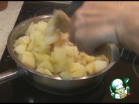 С картофеля сольём воду и отправляем на сковороду к луку и грудинке. |