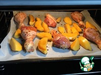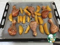 На противень, застеленный пергаментной бумагой, выкладываем куриные ножки. В оставшемся маринаде вымакиваем картофель. И также выкладываем его на противень. |