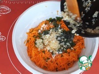 Нашу тыкву почистим и натрем на терке. Добавим к ней зелени у меня петрушка. |