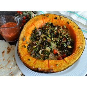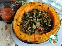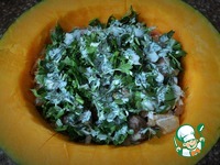 Обжарить оставшийся лук, вымытую петрушку порубить, добавить всё в тыкву. Залить сливками. Накрыть фольгой и отправить в духовку, 35 - 45 минут 200 градусов, до мягкости тыквы. |