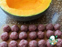 Тыкву разрезать пополам, вычистить семена и часть мякоти, сделать устойчивой, срезав дно. Из фарша сделать фрикадельки, обжарить на 1 ст. л. растительного масла. |