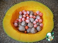 В мякоти тыквы сделать неглубокие надрезы, посолить. В тыкву положить фрикадельки, помидоры черри. |