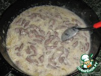 Обжарить на сковороде вместе с луком до готовности.Присыпать мукой и, постоянно помешивая, влить молоко, посолить и чуть поперчить для аромата. |