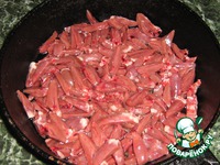 С сердечек обрезать лишний жир и разрезать их вдоль на четыре части. |