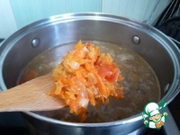 Сразу же в кастрюлю отправить овощную заправку. Довести до кипения и варить еще минут 10-15. Выровнять вкус солью и сахаром. |