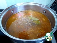 За пять минут до готовности положить пару лавровых листьев и щепотку укропных семян (это по вкусу). Дать настояться 15 минут. |