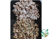Грибы почистить, порезать и обжарить на сковороде с 1 луковицей. |
