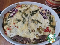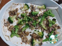Следующий слой грибы и брокколи. И снова часть соуса (2/3половника). И так чередуйте, до тех пор пока хватит начинки и высоты формы. |