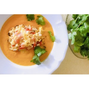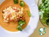 В глубокую тарелку налить морковный соус, выложить готовую капусту из духовки, украсить зеленью. |