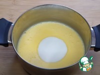 К желткам добавить молоко и хорошо размешать, потом всыпать сахар и 50 грамм масла и поставить на плиту варить (до загустения). |