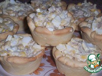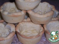 отрываем по кусочку и кладём в форму,разминаем руками по всей формочке,если хотите наполнить салатом тарталетки,то на тесто насыпаем фасоль или горох,и выпекаем при 220гр,10-15 минут