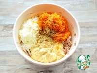 Добавьте натертые на мелкой терке белки от яиц и отварную морковь. Сюда же добавьте масляно-желтковую массу из 1 шага. Приправьте перцем |