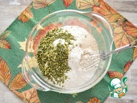 Муку смешайте с крахмалом, солью, дрожжами и сушеной зеленью. Зелень на свой вкус. У меня сушеная петрушка и зеленый лук |