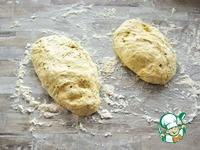 Обильно присыпьте поверхность мукой, выложите аккуратно тесто на рабочую поверхность, не обминая, разделите на 2 части. |