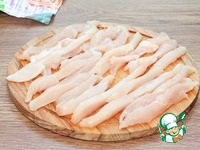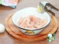 1. Замаринуем курочку. Куриную грудку нарезать небольшими порционными полосками и выложить в миску. |
