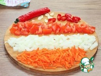 7. Приготовим соус. Нарезать очищенные овощи: лук - маленькими кубиками, перец - полосками, морковь - соломкой, помидоры дольками и чеснок - слайсами. |