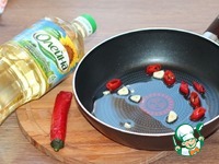 9. На разогретом подсолнечном масле обжариваем острый перец и чеснок. Затем овощи убираем, масло оставляем. |
