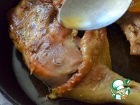 Поливая соком, жарить на медленном огне до прозрачного сока от прокола в самом толстом месте, огонь ниже среднего, минут 15. |